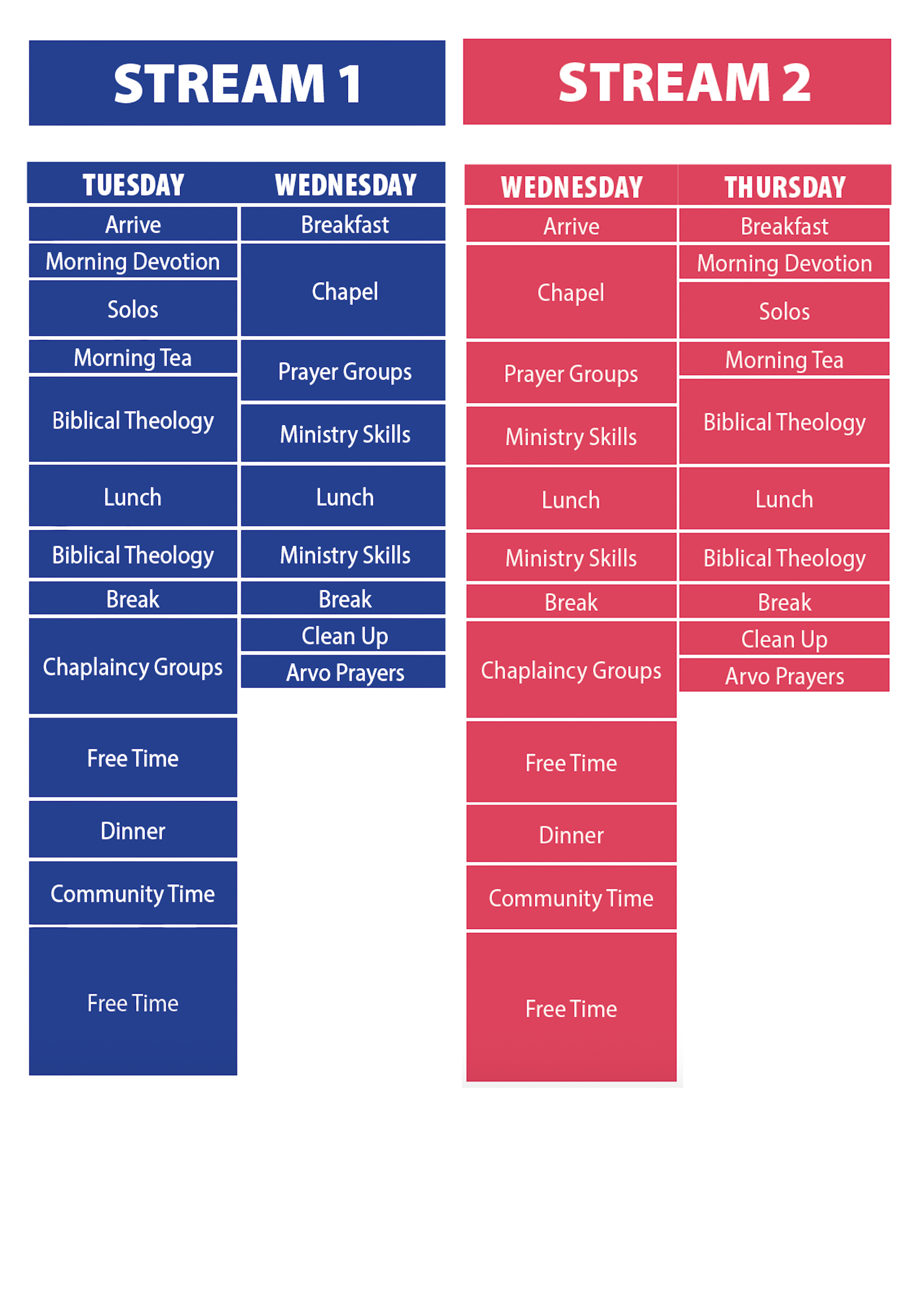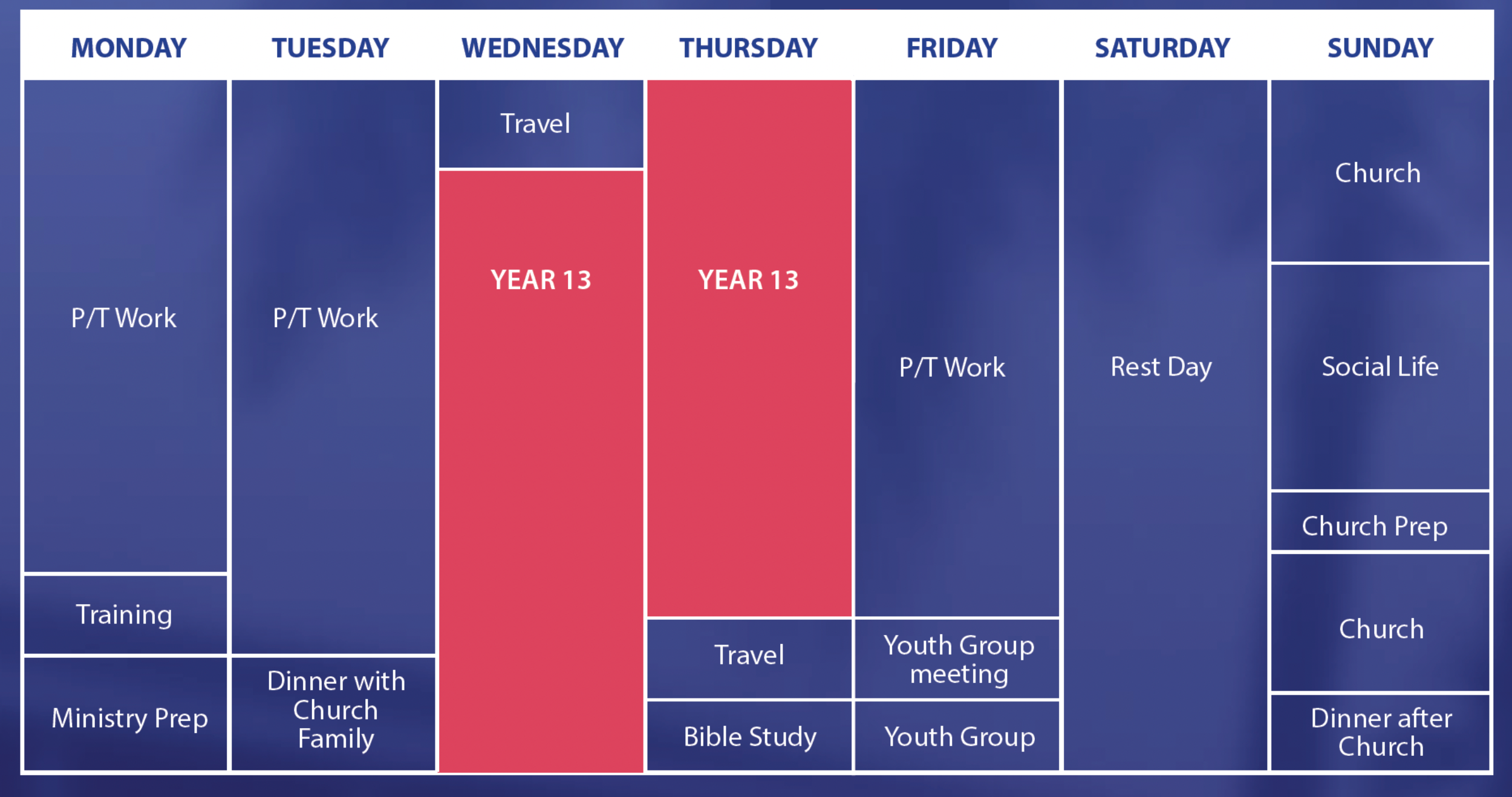 A regular week will vary from student to student. Below is an example timetable of a Tuesday - Wednesday Stream student, working a part-time job and volunteering in your local church.